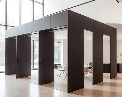 Современные мобильные перегородки оснащаются роликовыми системами, магнитными креплениями и складными механизмами («гармошка»), что облегчает их перемещение и установку. Некоторые модели могут быть автоматизированы с помощью электроприводов для более удобного и быстрого трансформирования пространства.